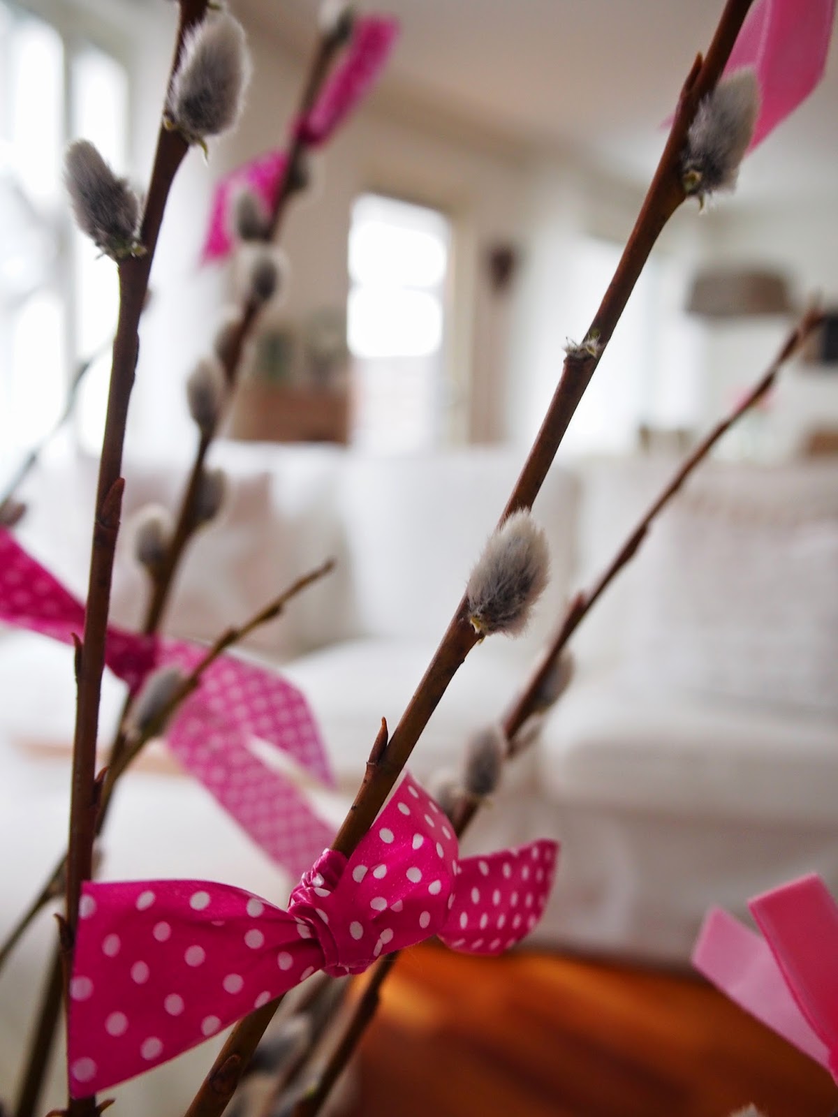 Kävimme jo eilen ostamassa Hakaniemen torilta pajunkissoja ja niitä sitten koristeltiin illalla. Niistä tuli oikein kaunis kimppu, vai mitä? 🙂