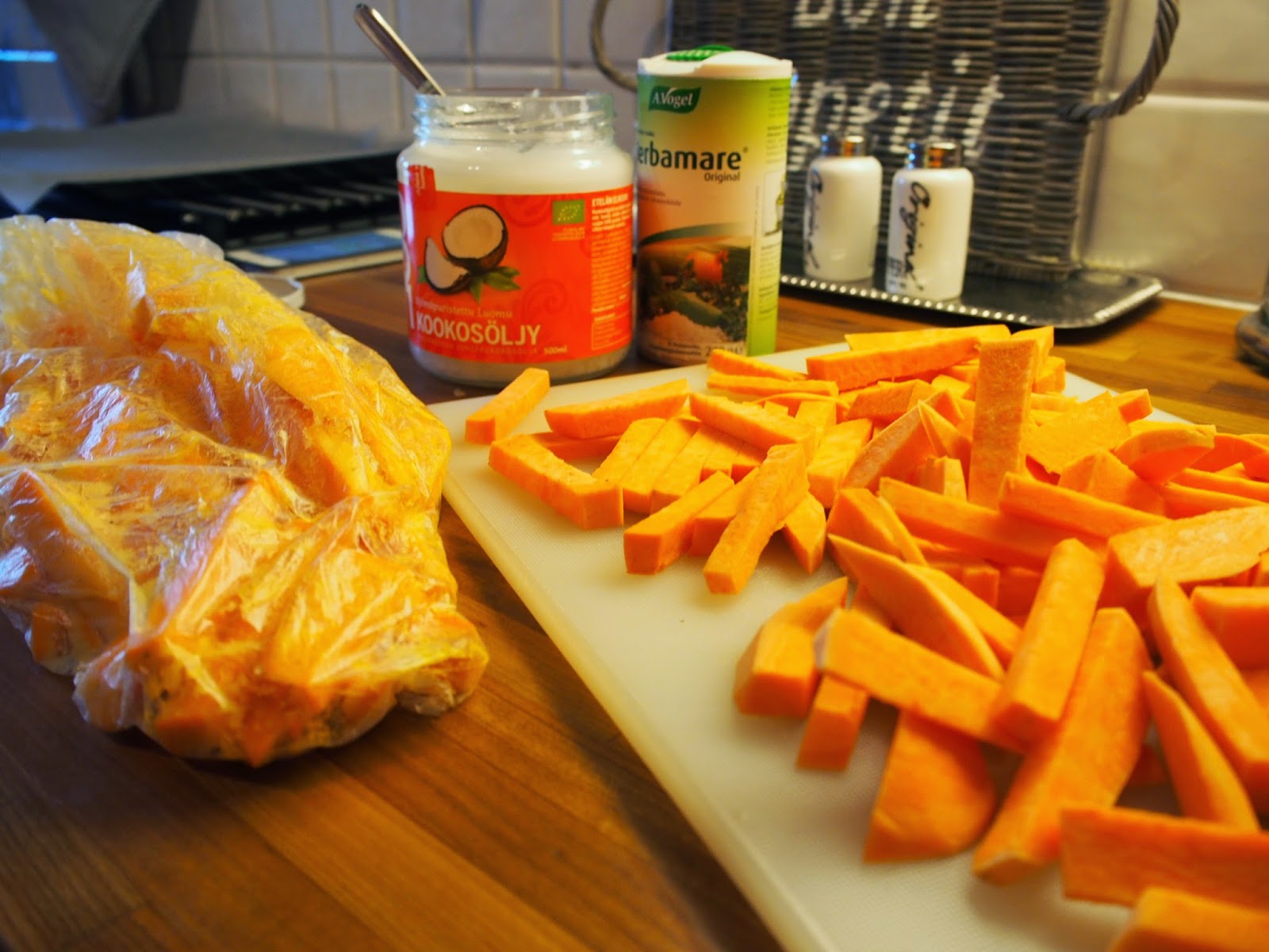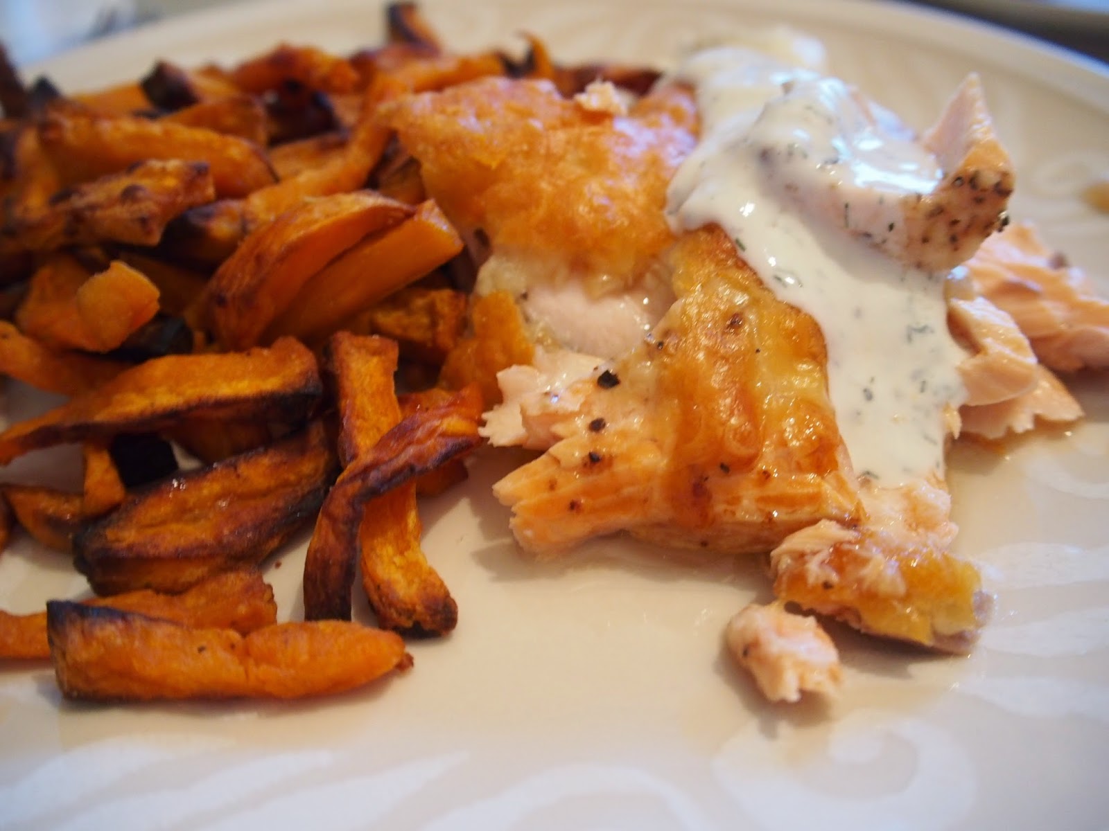 Pilkoin bataatit ja sekoitin pussissa niihin Cocovin kookosöljyä sekä herbamaren maustetta. Kookos antaa kivan maun ja tekee bataatista mehukkaan. Lohifileeseen lisäsin vain pinnalle suolaa, sitruunapippuria sekä reilusti juustoraastetta. Dipit tein sekä kermaviiliin että creme fraicheen.