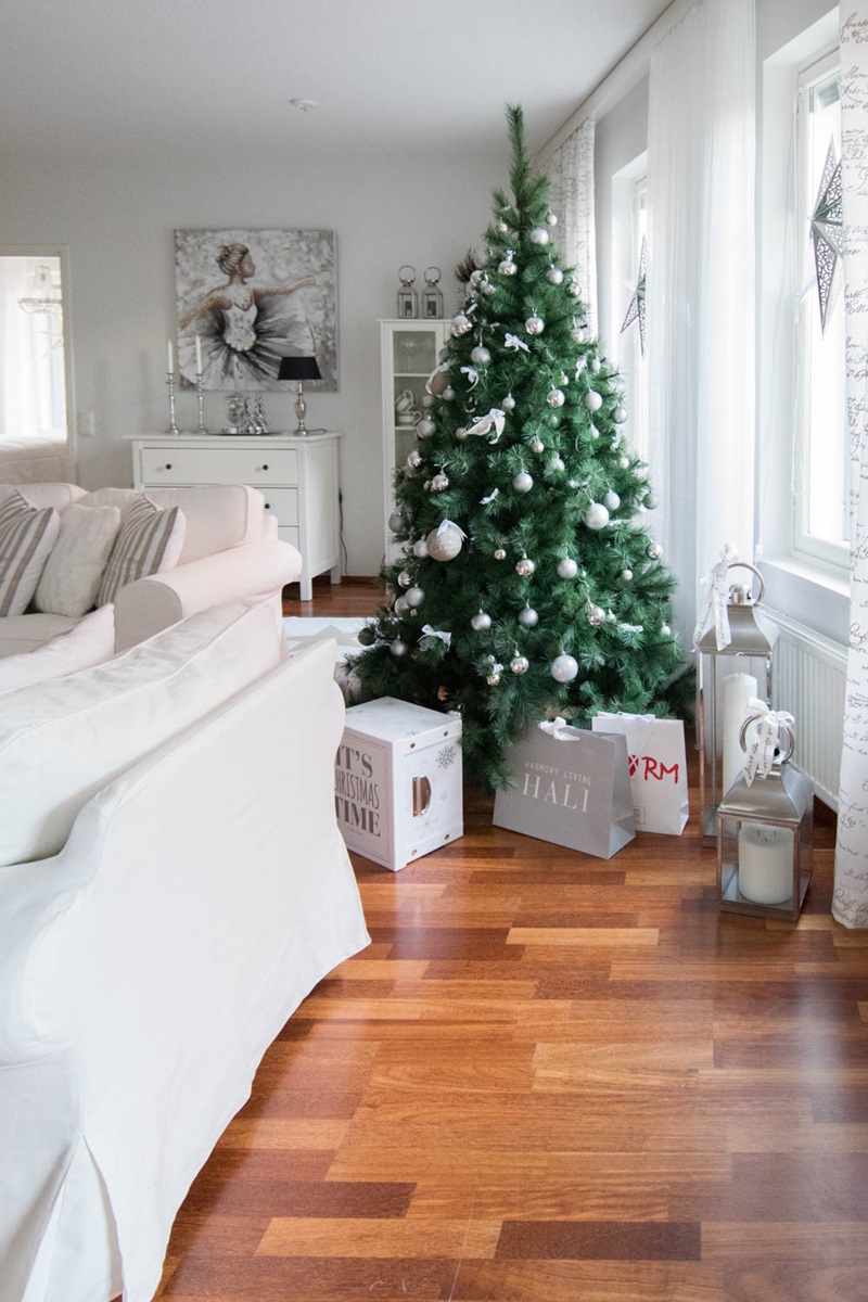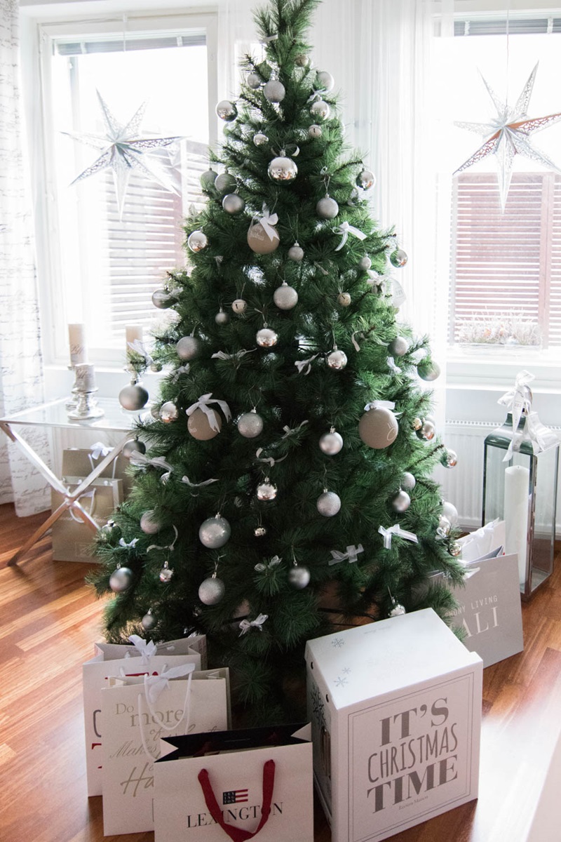 Koristeita on hankittu niin White on Whitesta, Clas Ohlsonilta kuin Sinellistä. Koristeissa pysyttelin hopean ja valkoisen väreissä, näin kuusen kaunis vihreä väri pääsee sieltä esille. Rusetit ovat mielestäni söpöjä yksityiskohtia ja ehkä hieman vievät perinteisen nauhan asemaa. Valoja en myöskään erikseen kuuseen laittanut ja onhan ikkunoissa kauniin hopeiset joulutähdet. Tähdetkin ovat muuten Clasulta ostettu.
