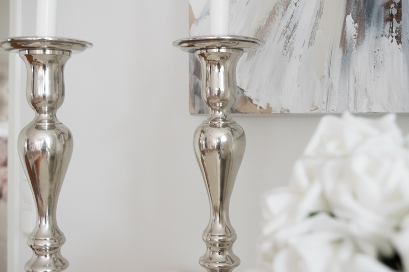 En olekkaan esitellyt teille näitä jo kuvissa vilahtaneita kynttilänjalkoja. Hankin ne samalla reissulla Pentikistä, kun ostin lampunjalat ja varjostimen. Nämä hopeiset kynttilänjalat olivat silloin alennuksessa ja hintaa muistaakseni vain 15 euroa/kpl. Pidän niiden muodosta ja siitä, että niihin voi laittaa pienen pöytäkynttilän tai pitkän kruunukynttilän. Juu, meiltähän kyllä löytyy monia erilaisia jalkoja, mutta niitä on mukava vaihdella fiiliksen mukaan 😉