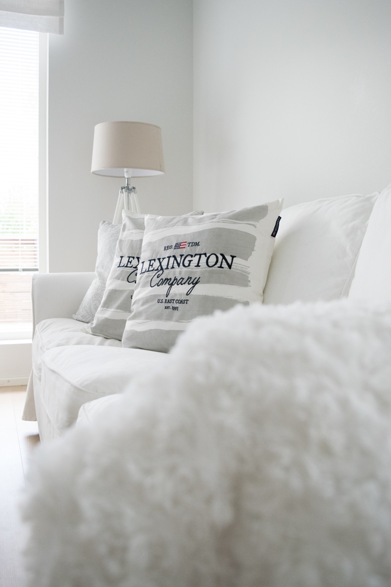 Sohvan yläpuolella olevalle seinälle on vielä etsinnässä taulu/tauluja. Myös sohvapöytä on hakukessa tai J:n ehdottama isompi rahi pöydän tilalle. On ollut hauska huomata kuinka muuton yhteydessä J:tä on tainnut puraista sisustuskärpänen ;D Hän ehdotti myös uuden sängynpäädyn hankintaa, mutta katsotaan miten sen hankkeen kanssa käy.. Kauniin harmaat Lexingtonin tyynyt on kuvauslainassa White on White liikkeestä. Hieman vielä mietin niiden kotiuttamista, mutta vähintäänkin värimaailmaltaan samankaltaiset tulee tilalle.