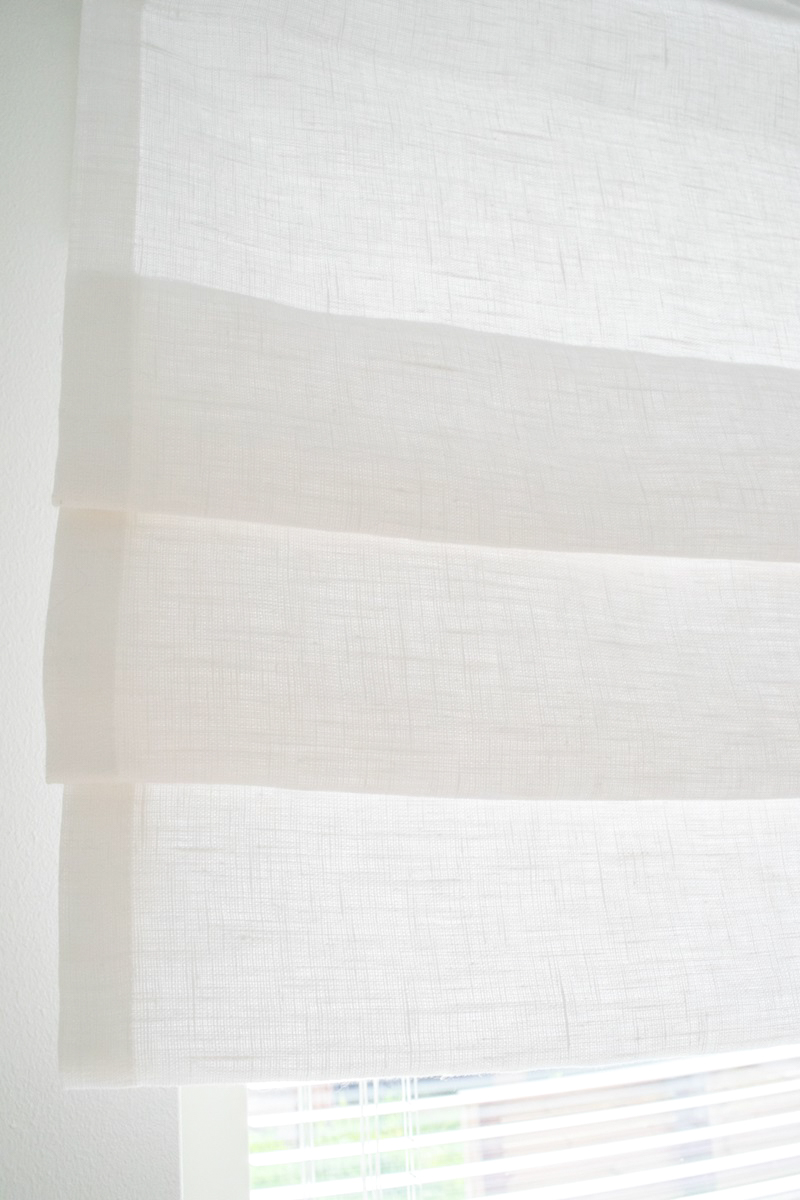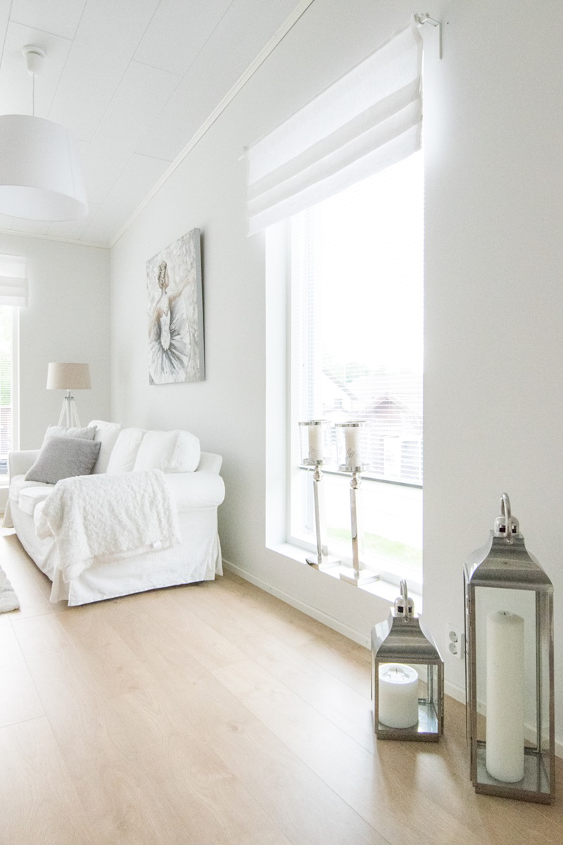 Olimme tuolloin lähdössä Pohjoisen reissuun ja kävimmekin sitten matkan varrella poikkeamassa liikkeessä. Jutta halusi minun vielä näkevän muutaman pellavakankaan eri sävyn, jotta valinta on varmasti se oikea. Päädyin puhtaanvalkoiseen sävyyn, joka sulautuu seinien väriin eikä riitele muun valkoisen kanssa. Mitat oli jo toimitettu etukäteen ja viikon päästä sainkin toimituksen matkahuollon kautta 🙂