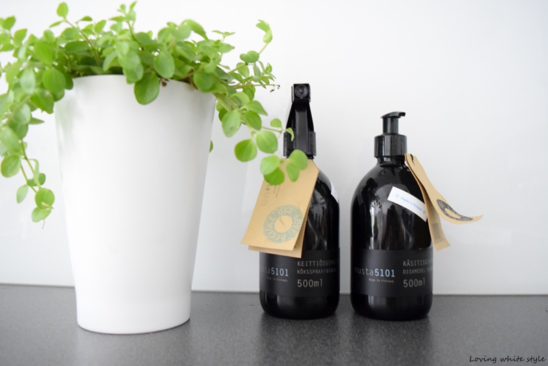Yleensä puhdistusaineet eivät ole kovin silmää hivelevän kauniissa purkeissa eikä niitä tee mieli pitää esillä. Vai oletteko toista mieltä? Toisin on näiden tyylikkäiden keittiösuihkeen ja käsitiskiaineen kanssa! Nämä raikkaan mustikkaisen tuoksuiset purkit pitää mielellään tiskipöydällä ja näin niihin ainakin meillä tartutaan useammin 😉 Tämä Musta5101 tuotesarja on kokonaan ekologisesti Suomessa valmistettu, joten plussat myös siitä!