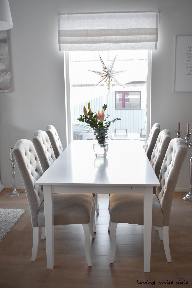Hankimmekin tänne muuttaessamme valkoiset keinonahkaiset tuolit, jotka olivat tarpeeksi kevyet ja ilmavat ruokailutilaan. Nämä tuolit eivät olleet ehkä parhaimmat istua (varsinkaan kipeän häntäluun kanssa) saati sitten nahan nihkeyden vuoksi. Muuten ne sopivat meille loistavasti.